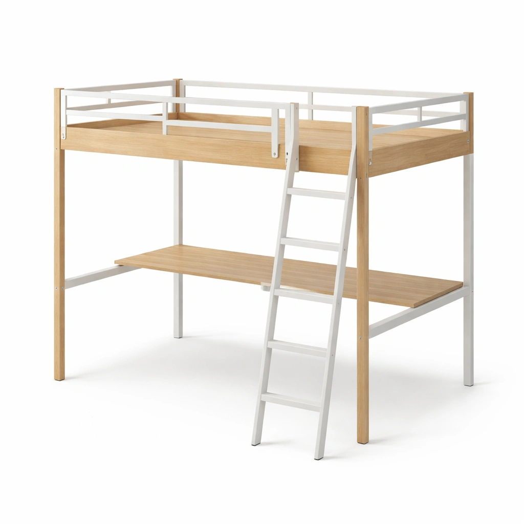 Cama loft Alta de Madera con Escritorio Blanco y Natural
