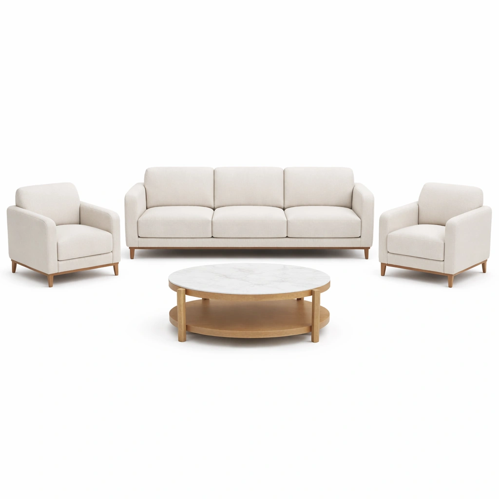 Conjunto de sofá de Tela con Sillones y Mesa de Centro Redonda Beige