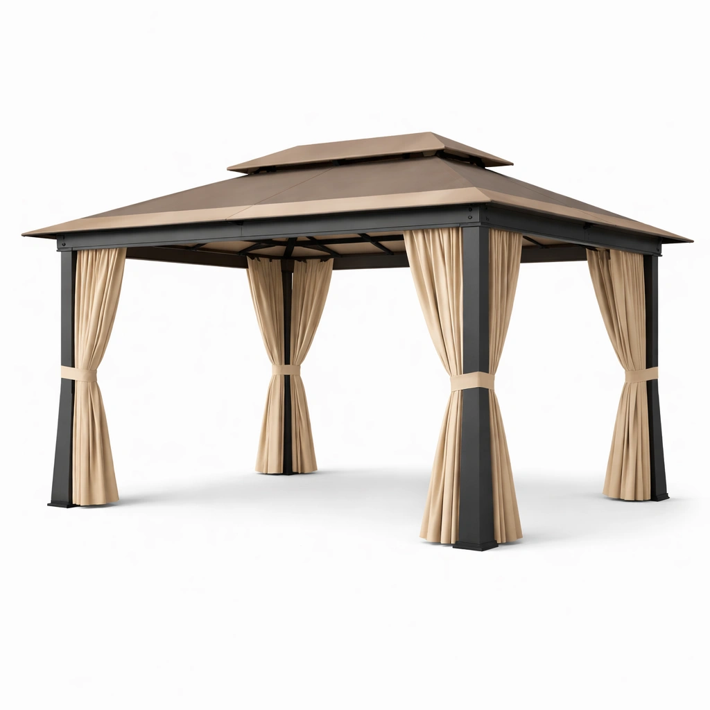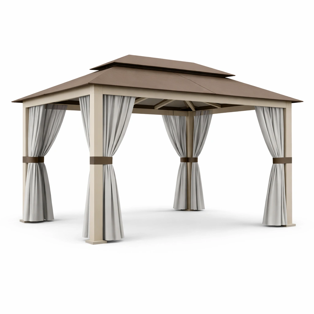 Gazebo con Techo de Doble Nivel y Cortinas de Poliéster