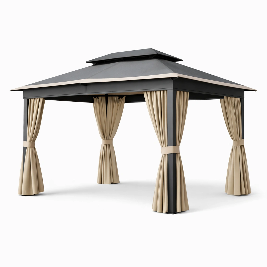 El color principal de las cortinas es Beige y la estructura es Gris oscuro. Cuenta con resistencia al agua, protección UV y ventilación en la parte superior. Se incluyen cortinas y puentes de velcro.